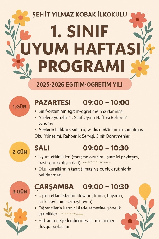 2025- 2026 Eğitim Öğretim Yılı 01.09.2025 Pazartesi günü Okul Öncesi ve Birinci Sınıf Öğrencilerimiz için başlıyor. Okulumuzda 3 gün boyunca uyum haftası etkinlikleri düzenlenecektir.